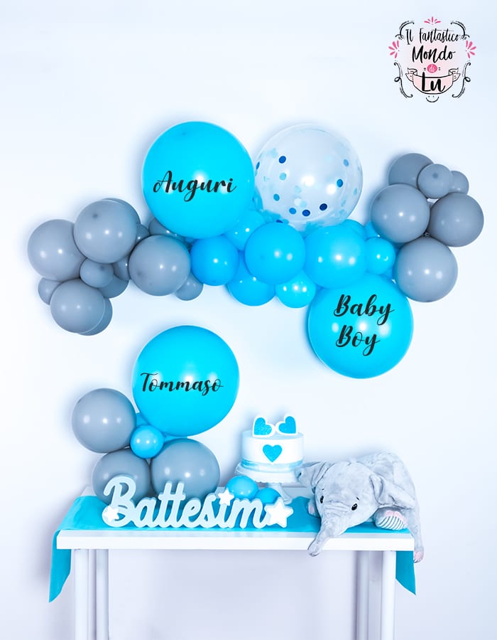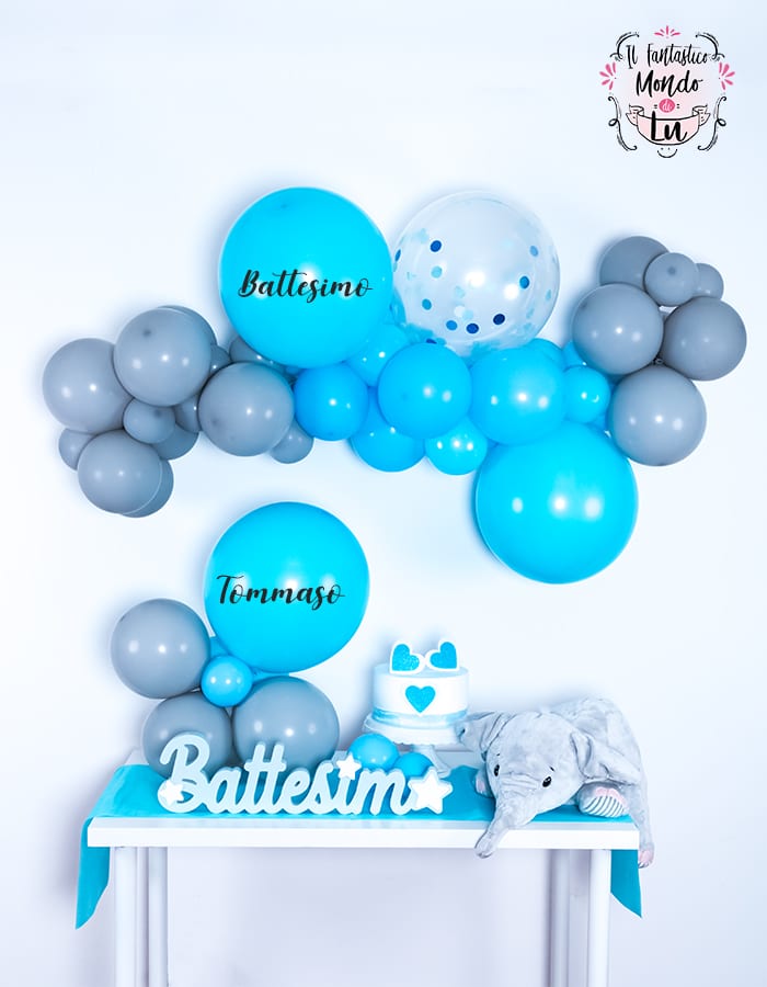 Vuoi inserire nel tuo party un allestimento molto in voga in questo momento? Questa ghirlanda di palloncini molto fashion e dalla bicromia celeste e grigio darà un tocco speciale alla tua festa! Grazie al mio tutorial e al kit che ho creato per te sarà facile prepararla! Nel kit troverai tutto il necessario per fare due bellissime decorazioni e seguendo le mie istruzioni sarà veramente semplice realizzarle. La ghirlanda di palloncini può essere facilmente appesa e può diventare uno sfondo per angoli strategici del party, come l’angolo del buffet, della torta o della confettata. E il centrotavola può andare a decorare il tavolo del buffet, del festeggiato, dei regali. Cosa aspetti allora? Acquista il kit e stupisci gli invitati alla tua festa!