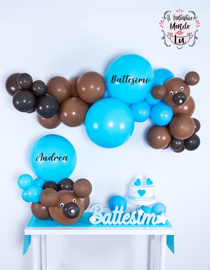 Vuoi inserire nel tuo party un allestimento molto in voga in questo momento? Questa ghirlanda di palloncini molto fashion e dalla bicromia celeste e marrone darà un tocco speciale alla tua festa! Grazie al mio tutorial e al kit che ho creato per te sarà facile prepararla! Nel kit troverai tutto il necessario per fare due bellissime decorazioni e seguendo le mie istruzioni sarà veramente semplice realizzarle. La ghirlanda di palloncini può essere facilmente appesa e può diventare uno sfondo per angoli strategici del party, come l’angolo del buffet, della torta o della confettata. E il centrotavola con il musetto dell’orsetto può andare a decorare il tavolo del buffet, del festeggiato, dei regali. Cosa aspetti allora? Acquista il kit e stupisci gli invitati alla tua festa!