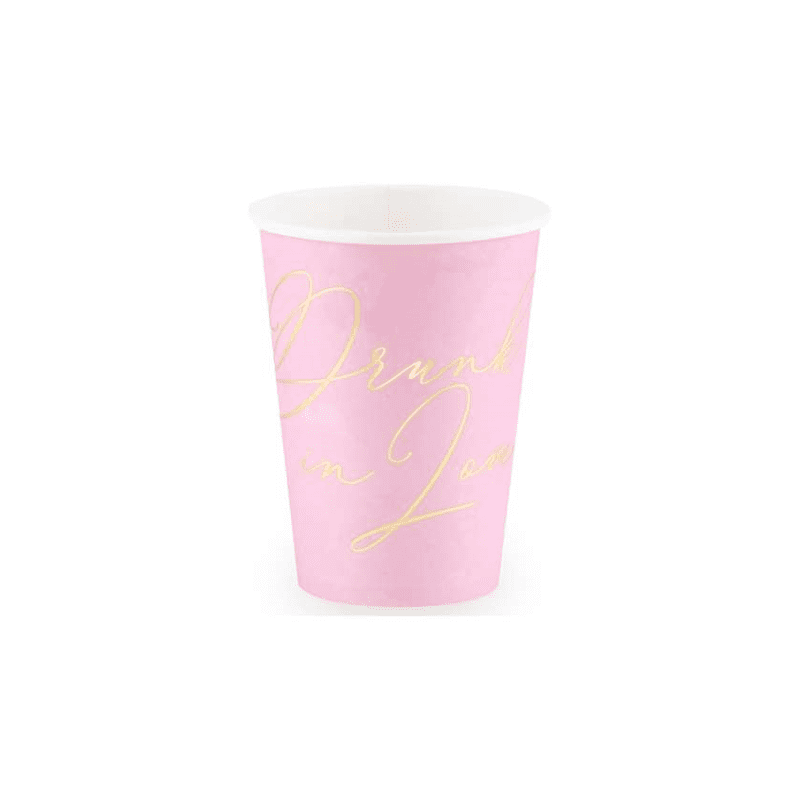 Piatti esagonali rosa e oro da abbinare al bicchiere rosa con la scritta oro “drink in love”. Questo coordinato sbarazzino e moderno è molto carino da usare in una festa, magari al momento della torta. Se ci sono tanti invitati è utile usare piatti e bicchieri monouso.